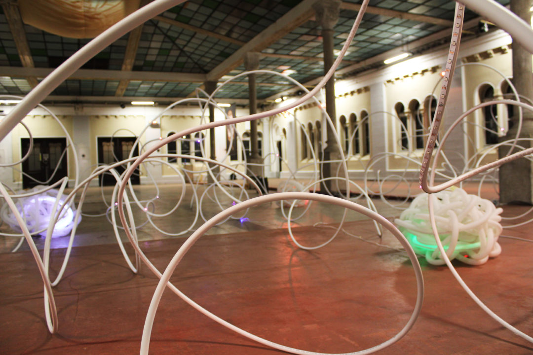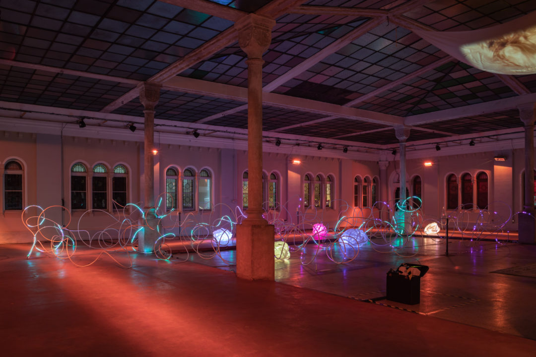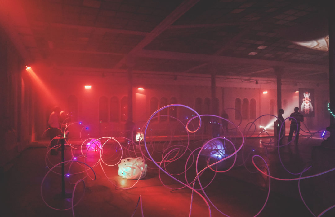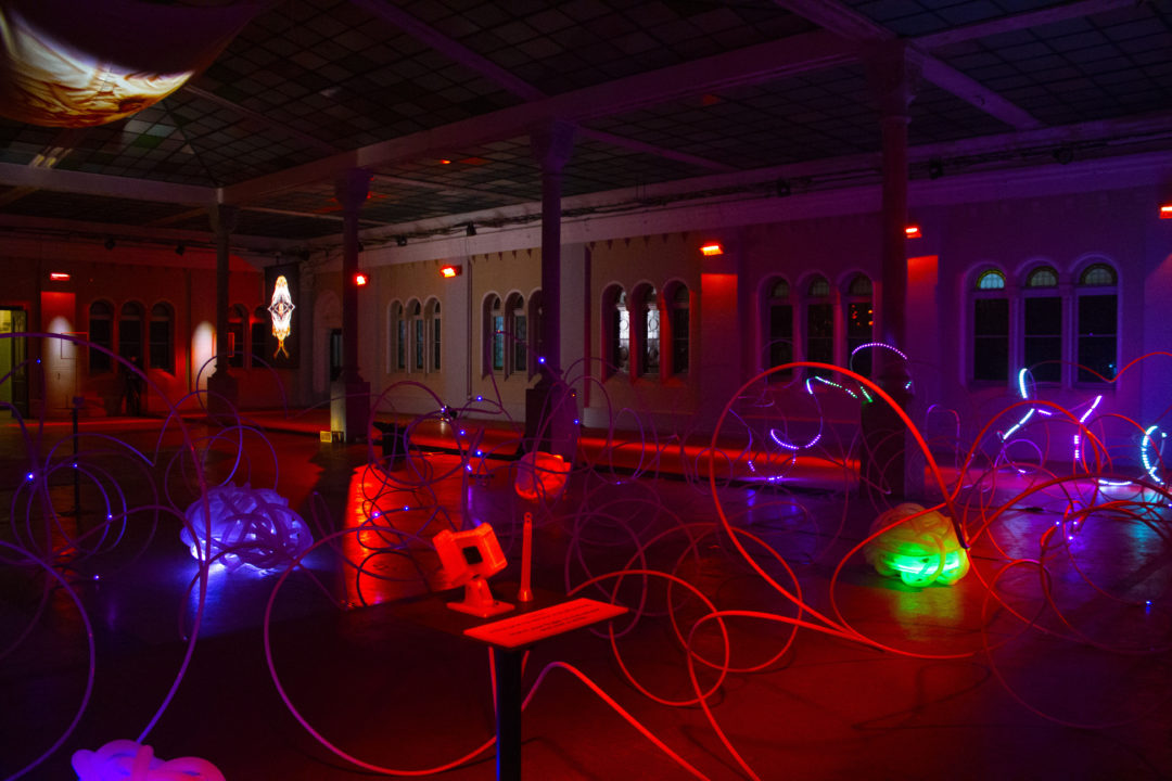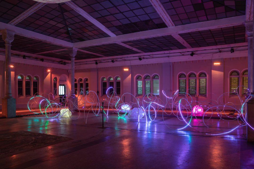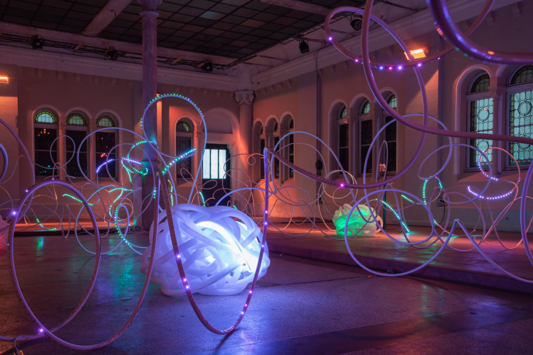 The interactive installation deals with the issue of constant circulation and circulates in constantly repeating cycles. The work is the materialization of a new nature that man creates. Everything in the world keeps repeating itself over and over again, wars, pandemics, architectural styles, life and death. Some of us create our own cycles that we just don’t like to get out of, we find a rhythm of life, a stereotype that we stick to and constantly revolve within it. We get up in the morning, go to work, after work we open a beer, put the children to sleep, watch a series and go to bed. After twenty years, we can perhaps afford a mortgage, pay it off and then die and everything starts again somewhere else all over again and all over again, just a little differently, anew. It’s hard to get out of these cycles, it’s so natural, normal. The world is changing, people are still circulating, instead of water lilies there are LED strips, plastic tubes have replaced vines, it’s our world, man created it. It is a new nature, what man has created is natural to him. Lights flash quickly, plastics peek out of the asphalt like worms from clay. How can we get out of the circulations? Can we break free from them? Each of us can get out, just materialize our courage and step out of the crowd. Those who step out will move the world a little further, towards the journey to Mars, nuclear catastrophe, new nature. The installation includes interactive light objects that react to humans (noise, heartbeat, weight, alcohol, temperature). The installation is mainly made of discarded or recycled materials that were found or donated by companies as defective pieces. I would like to mention the sponsorship gift of RUBIDEA CZ s.r.o.
