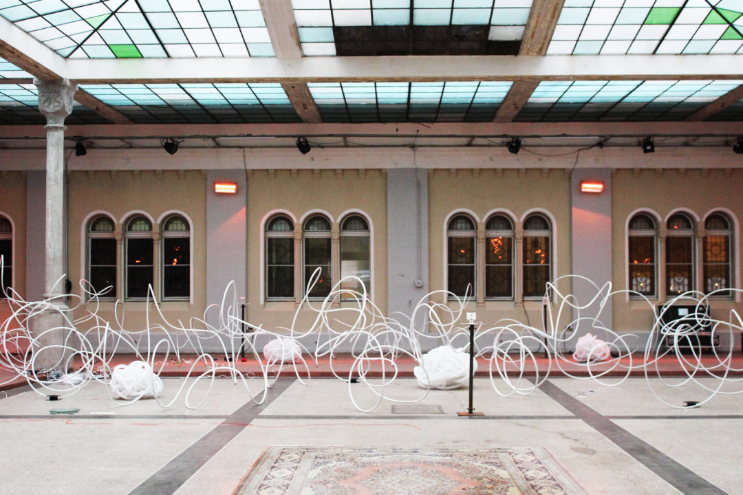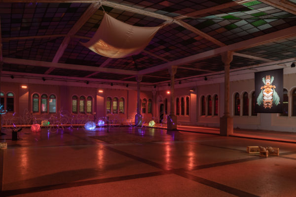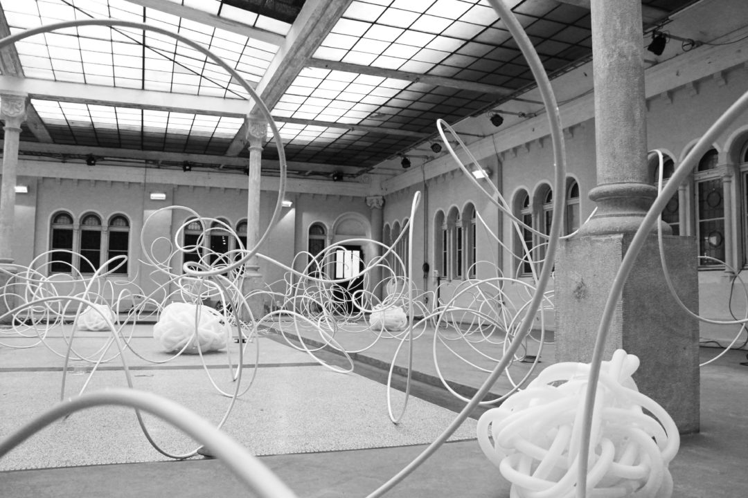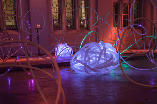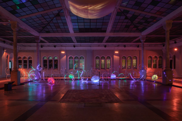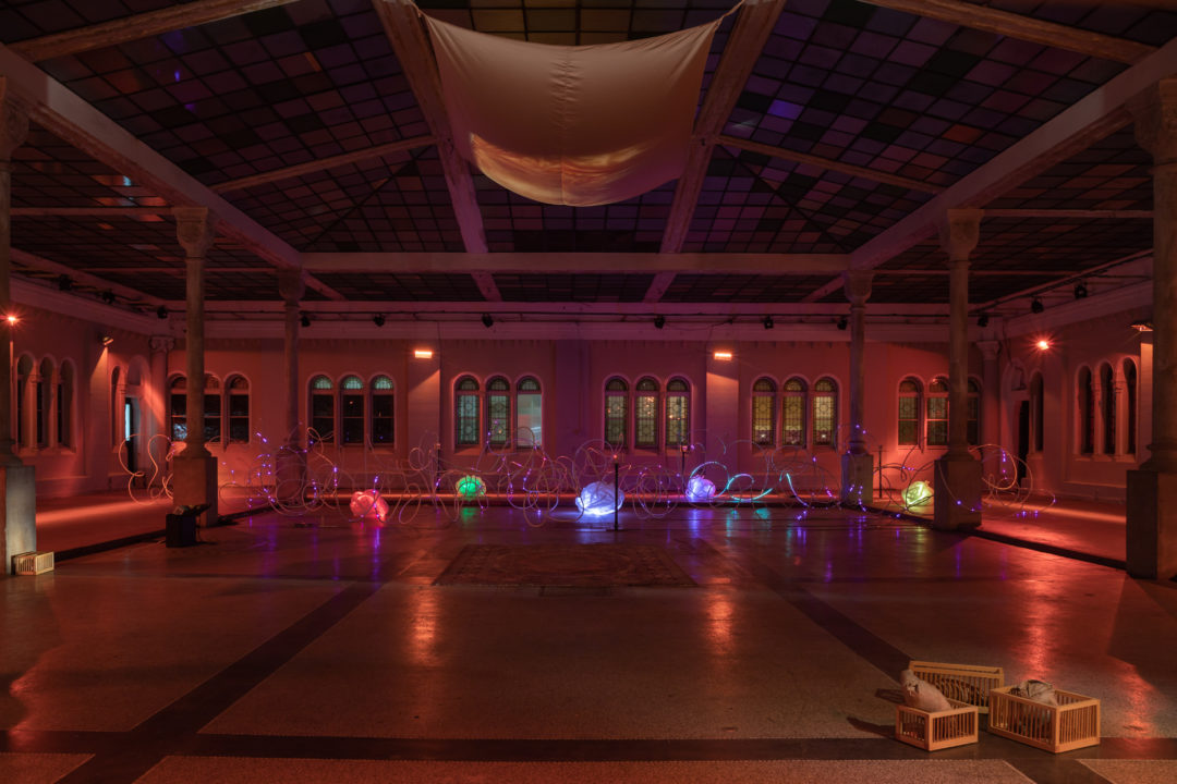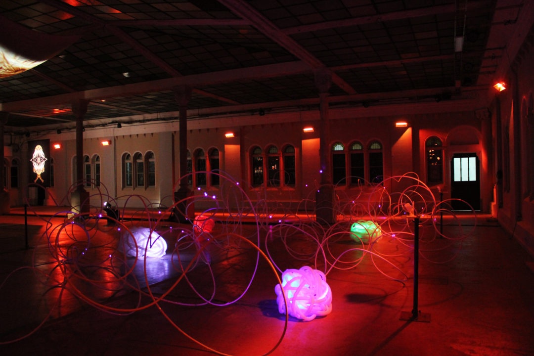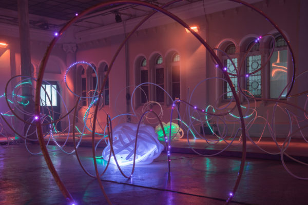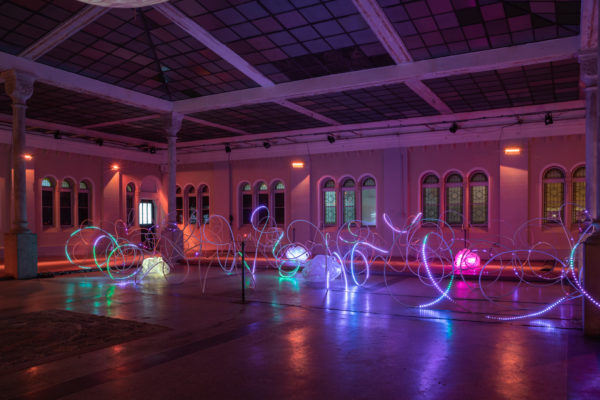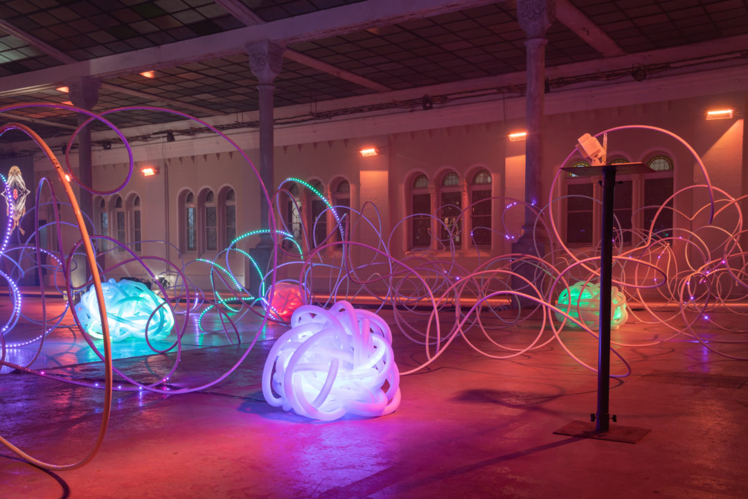 The interactive installation deals with the issue of constant circulation and circulates in constantly repeating cycles. The work is the materialization of a new nature that man creates. Everything in the world keeps repeating itself over and over again, wars, pandemics, architectural styles, life and death. Some of us create our own cycles that we just don’t like to get out of, we find a rhythm of life, a stereotype that we stick to and constantly revolve within it. We get up in the morning, go to work, after work we open a beer, put the children to sleep, watch a series and go to bed. After twenty years, we can perhaps afford a mortgage, pay it off and then die and everything starts again somewhere else all over again and all over again, just a little differently, anew. It’s hard to get out of these cycles, it’s so natural, normal. The world is changing, people are still circulating, instead of water lilies there are LED strips, plastic tubes have replaced vines, it’s our world, man created it. It is a new nature, what man has created is natural to him. Lights flash quickly, plastics peek out of the asphalt like worms from clay. How can we get out of the circulations? Can we break free from them? Each of us can get out, just materialize our courage and step out of the crowd. Those who step out will move the world a little further, towards the journey to Mars, nuclear catastrophe, new nature. The installation includes interactive light objects that react to humans (noise, heartbeat, weight, alcohol, temperature). The installation is mainly made of discarded or recycled materials that were found or donated by companies as defective pieces. I would like to mention the sponsorship gift of RUBIDEA CZ s.r.o.